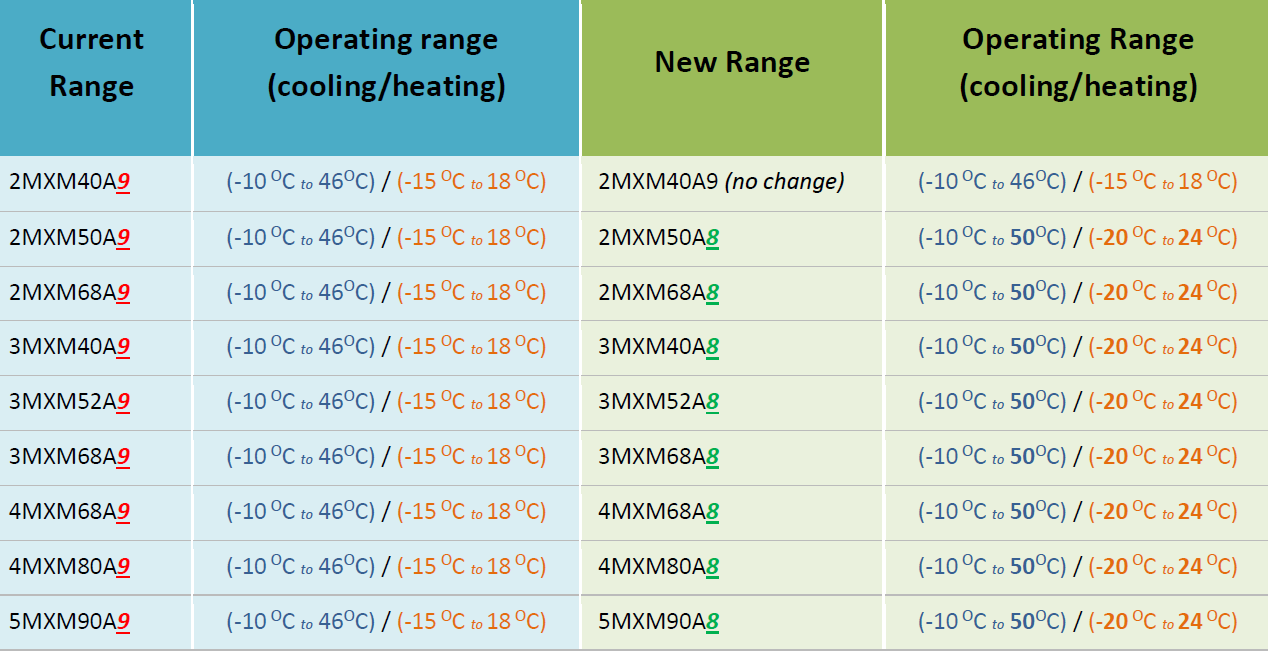From October 2025, the MXM-A8 Multi Split Condensers will offer a wider operation range, as shown in the chart below.